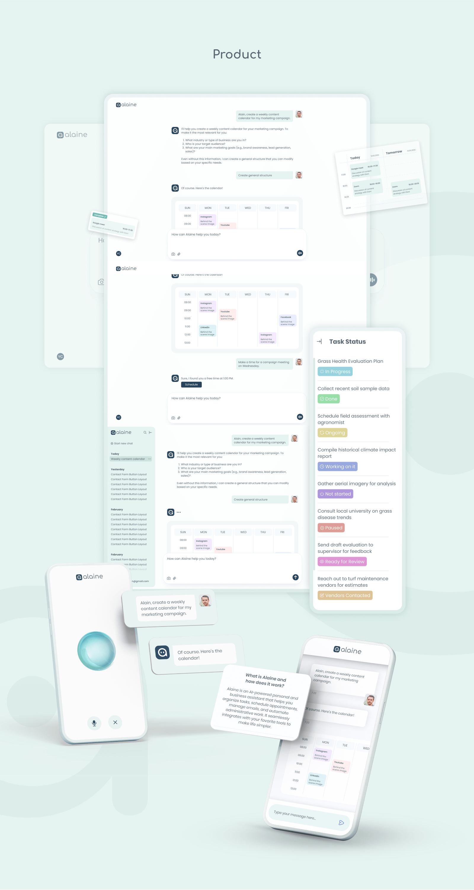 The main task was to integrate Alaine seamlessly into existing tools and workflows while keeping the interface minimal so users focus on results, and by using a modular architecture and context aware AI suggestions we guide users step by step from task creation to completion, refining every flow through user testing to deliver a fast intuitive experience for individuals and teams alike.